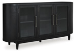 Series Features:Contemporary lifestyle design. Made of hardwood solids and Oak veneer. Rich layered black finish on textured wood grain surface. Collection is inspired by Art Deco designs with trend-right curved silhouettes. Table features an oval design and architectural inspired table pedestal. Can seat up to 8 people. Dining chair features an ultra sleek bent plywood back for contoured comfort and a cushion seat covered in a herringbone patterned gray fabric. D821-02A fully upholstered bucket chair is made with engineered wood frames and covered with an ivory colored bouclé fabric. Set on casters for easy mobility. Server features 3 glass cabinet doors, interior shelving, rounded case design and tapered legs.